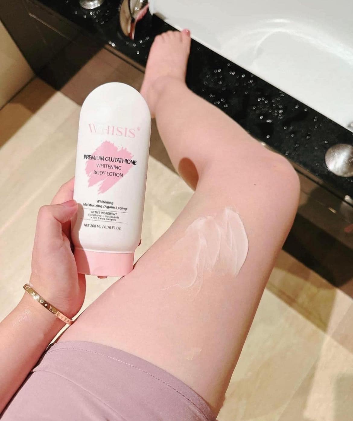 🔹 BƯỚC 4: Dưỡng trắng ban đêm với WHISIS Premium Glutathione Whitening Body Lotion