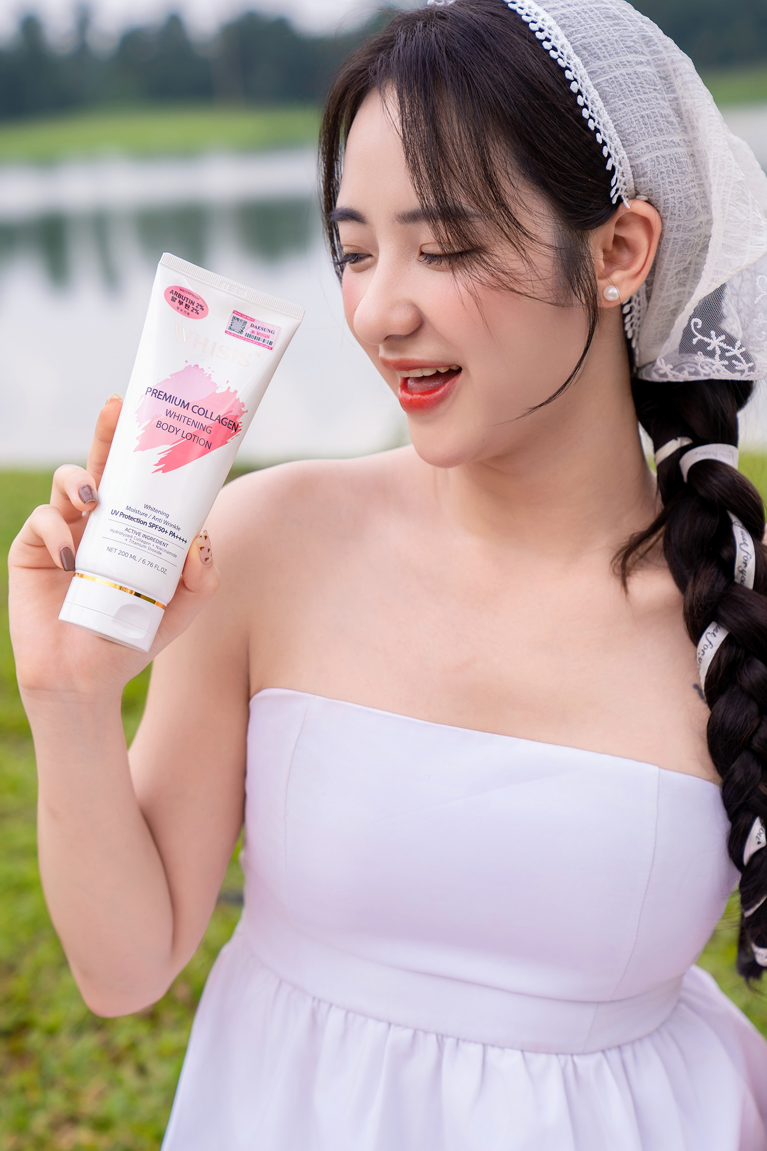 + Tên: Kem Body Trắng Da Chống Nắng Nâng Tone Trắng Hồng Rạng Rỡ WHISIS Premium Collagen Whitening Body Lotion 200ml SPF50+ PA++++