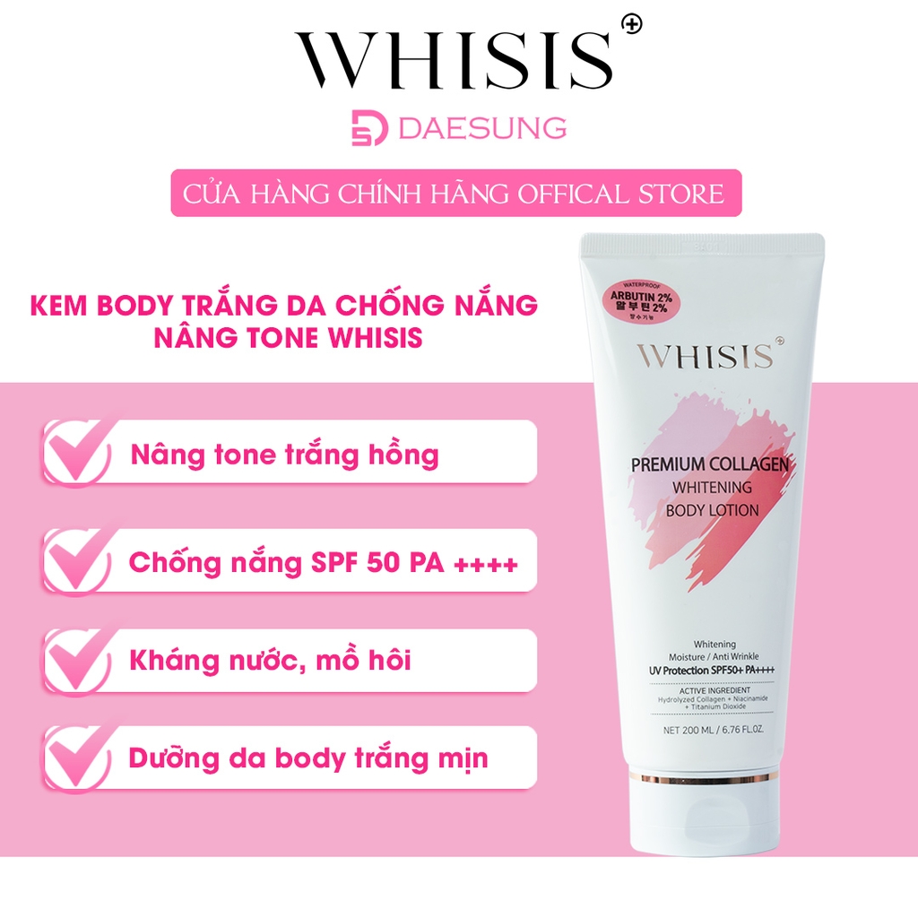 Kem Body Trắng Da Chống Nắng Nâng Tone Trắng Hồng Rạng Rỡ WHISIS Premium Collagen Whitening Body Lotion 200ml SPF50+ PA++++