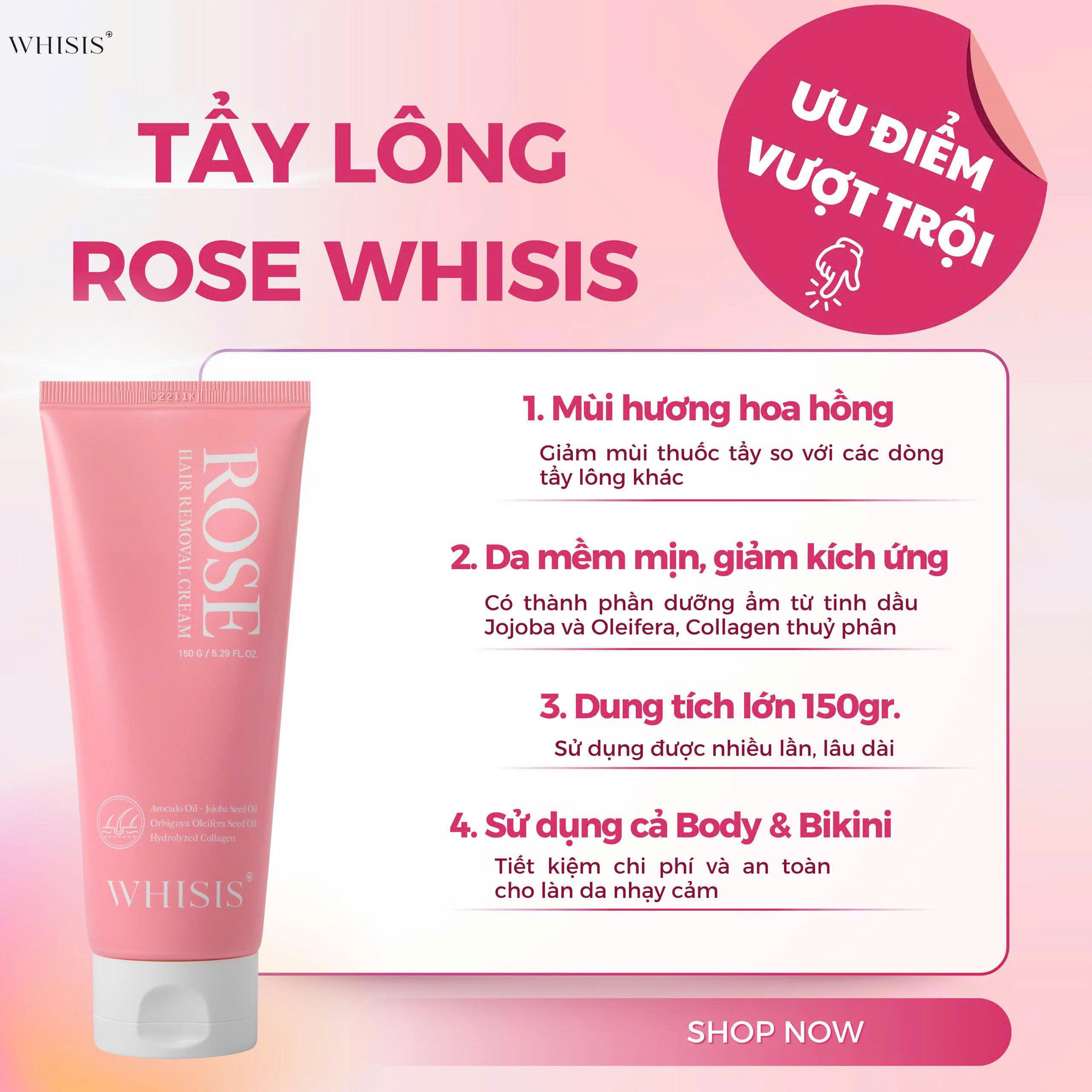 Kem Tẩy Lông Whisis Hương Hoa Hồng là lựa chọn tuyệt vời cho các nàng muốn làn da sạch lông – mịn màng – thơm dịu mà không cần ra spa hay chịu đau đớn. Dùng 1–2 lần/tuần là đủ để luôn tự tin diện váy áo cả tuần 🌸💃